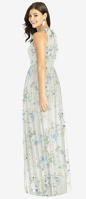 Shirred Skirt Jewel Neck Halter Dress with Front Slit in bleu garden