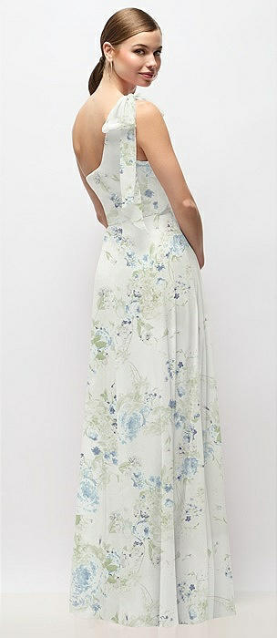Bow One-Shoulder Floral Satin Trumpet Gown in sage cottage rose