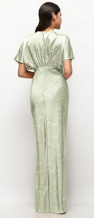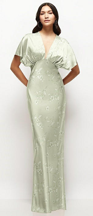 Plunge Neck Kimono Sleeve Floral Satin Bias Maxi Dress in vintage primrose celadon