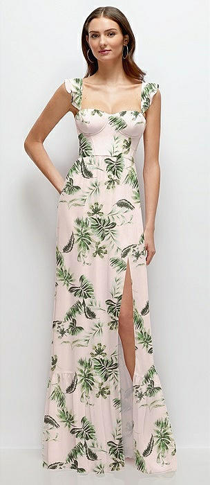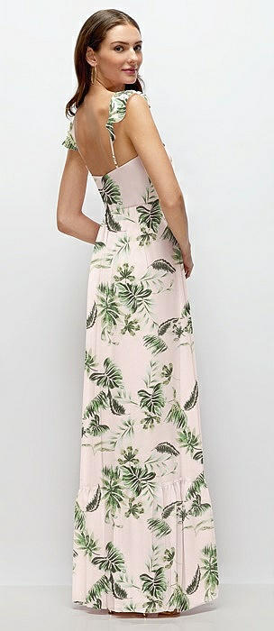 Ruffle Strap Chiffon Bustier Maxi Dress with Ruffle Hem A-Line Skirt in palm beach print