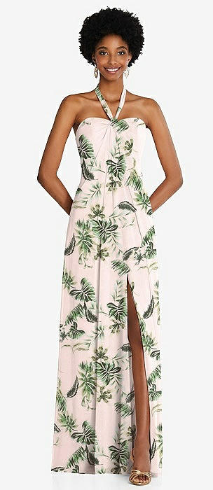 Stand Collar Halter Maxi Dress with Criss Cross Open-Back in palm beach print