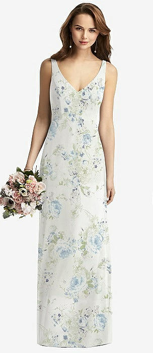 Deep V-back Floral Satin Trumpet Dress with One-Shoulder Cascading Bow in sage cottage rose