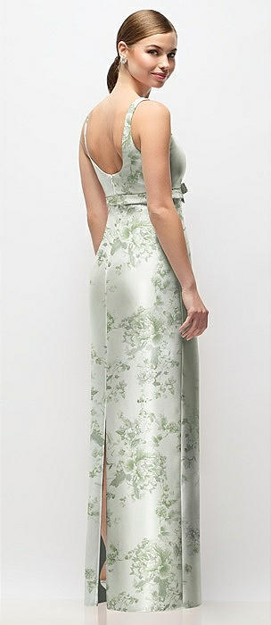 Floral Bateau Neck Satin Column Maxi Dress with Exaggerated Tail Bow Straps in sage cottage rose