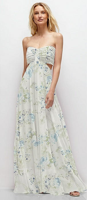 Strapless Empire Waist Cutout Maxi Dress with Covered Button Detail in bleu garden