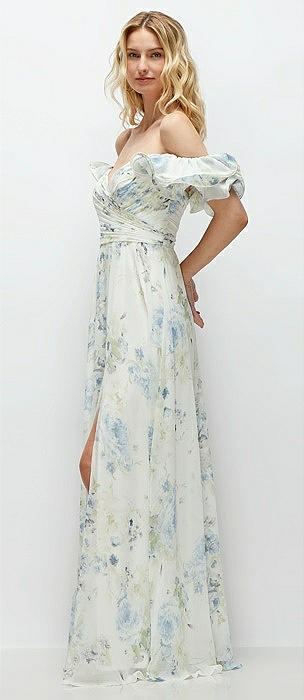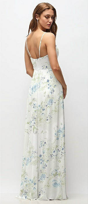 Wrap Bodice Floral Chiffon Maxi Dress with Adjustable Spaghetti Straps in bleu garden