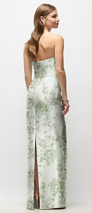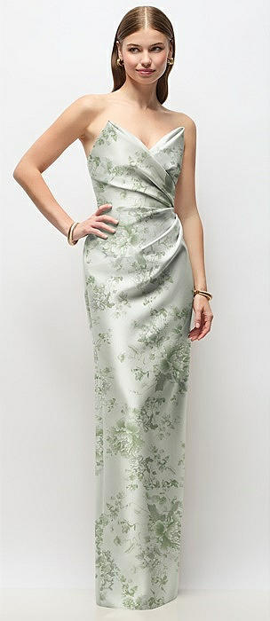 Strapless Asymmetrical Draped Satin Column Floral Maxi Dress in sage cottage rose