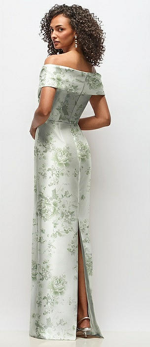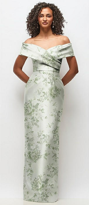 Draped Wrap Off-the-Shoulder Satin Column Maxi Dress in sage cottage rose