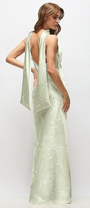 Draped Scarf Halter Open-Back Floral Stretch Satin Bias Maxi Dress with Adjustable Straps in vintage primrose celadon