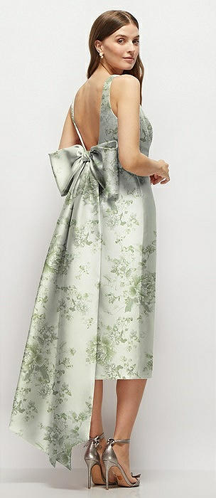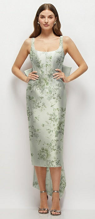 Floral Scoop Neck Corset Satin Midi Dress with Floor-Length Bow Tails