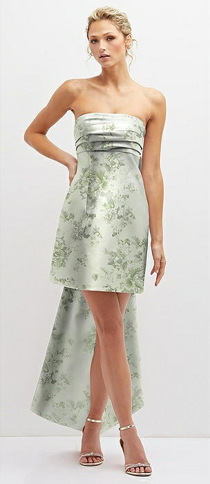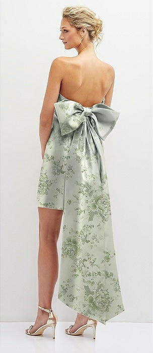 Floral Strapless Satin Column Mini Dress with Oversized Bow in sage cottage rose