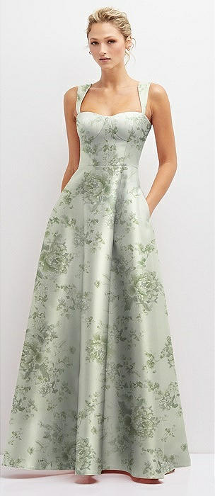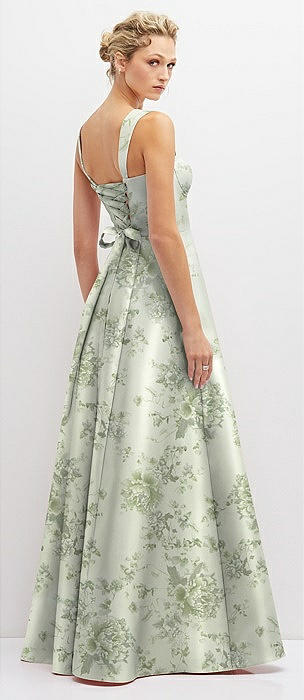 Floral Lace-Up Back Bustier Satin Dress with Full Skirt and Pockets in sage cottage rose