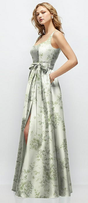 Scoop Neck Drop Basque Skirt Floral Satin Maxi Dress with Pockets in sage cottage rose