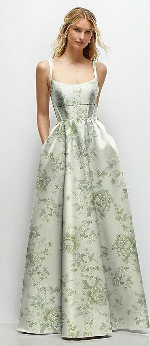 Floral Square-Neck Satin Maxi Dress with Full Skirt in sage cottage rose