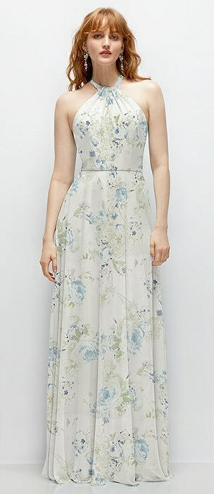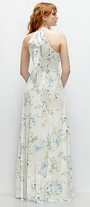 Shirred Halter Chiffon Maxi Dress with Back Sash-Tie Closure in bleu garden