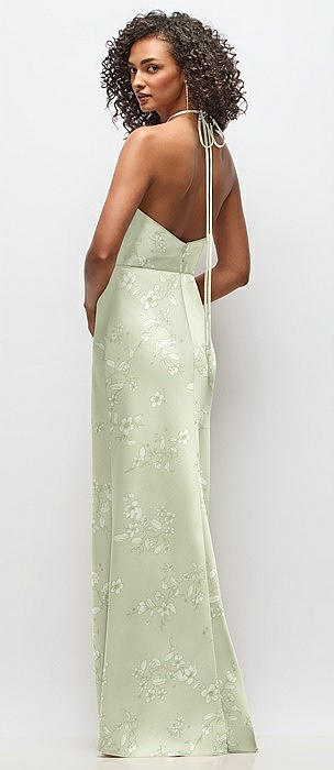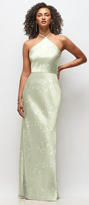 High-Neck Halter Floral Stretch Satin Maxi Dress with Bias A-line Skirt in vintage primrose celadon