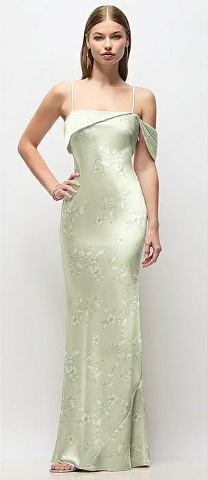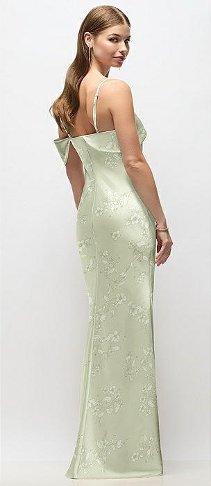 Asymmetrical Cuff Neck Floral Stretch Satin Bias Maxi Dress with Adjustable Spaghetti Straps in vintage primrose celadon