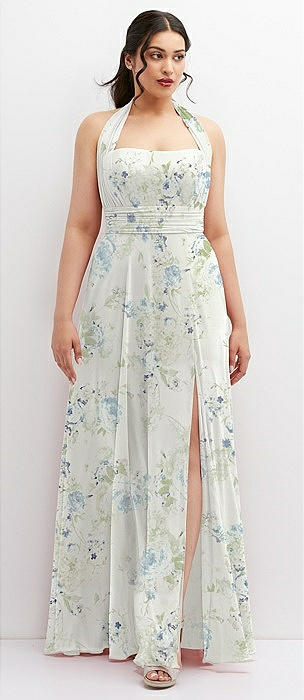 High-Neck Halter Floral Stretch Satin Maxi Dress with Bias A-line Skirt in vintage primrose celadon