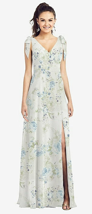 Bow-Shoulder V-Back Chiffon Gown with Front Slit in bleu garden