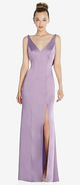 Draped Cowl-Back Princess Line Dress with Front Slit in pale purple