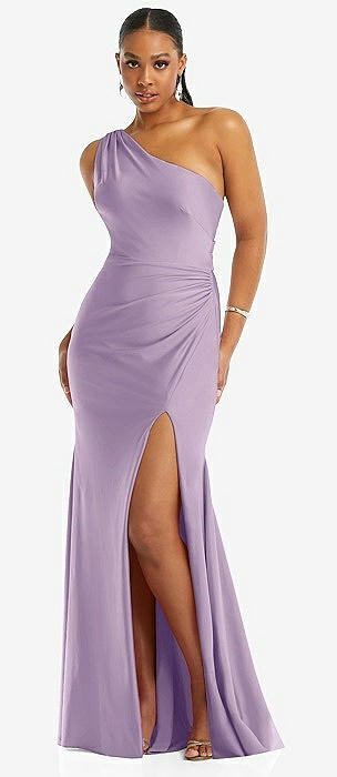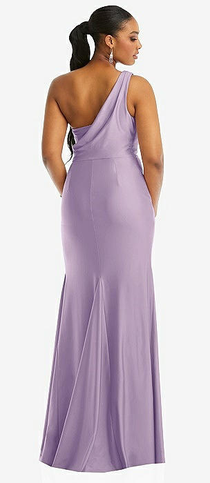 One-Shoulder Asymmetrical Cowl Back Stretch Satin Mermaid Dress in pale purple