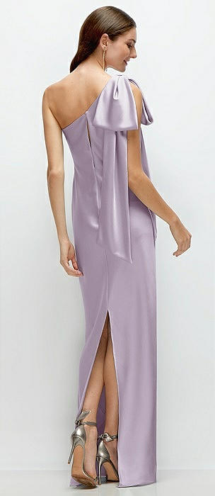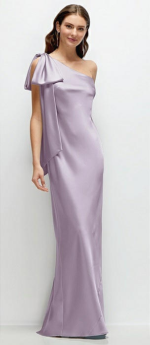 One-Shoulder Bias-Cut Satin Maxi Dress with Cascading Shoulder Bow in lilac haze
