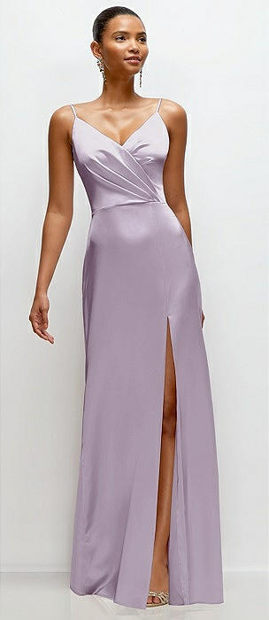 Pleated Faux Wrap Satin Maxi Dress with Adjustable Spaghetti Straps in lilac haze