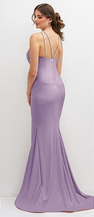 Halter Asymmetrical Draped Stretch Satin Mermaid Dress with Rhinestone Straps in pale purple