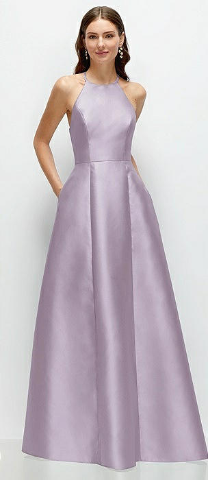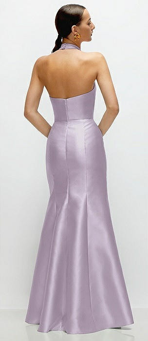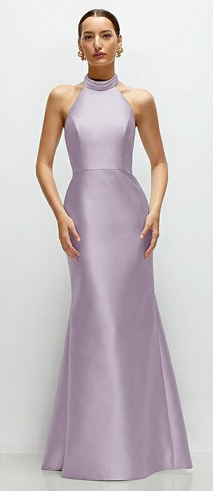 High-Neck Halter Open-Back Satin Trumpet Dress in lilac haze