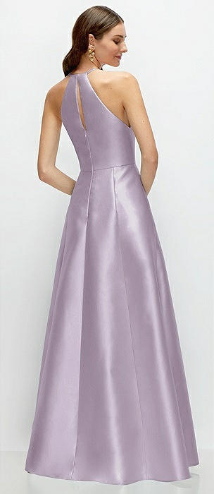 Jewel Neck Halter Full A-Line Satin Maxi Dress in lilac haze