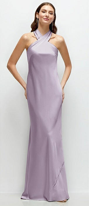 Criss Cross Halter Open-Back Stretch Satin Mermaid Dress in pale purple