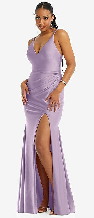 Deep V-Neck Stretch Satin Mermaid Dress with Slight Train in pale purple