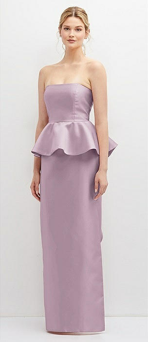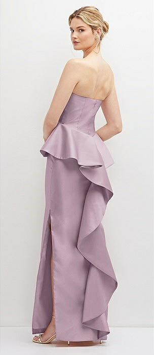 Strapless Satin Maxi Dress with Cascade Ruffle Peplum Detail in suede rose