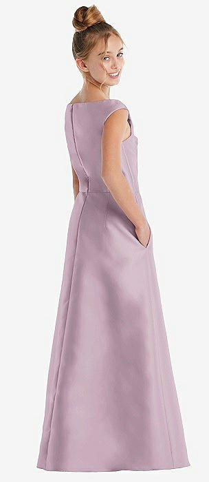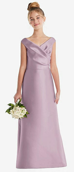 Off-the-Shoulder Draped Wrap Satin Junior Bridesmaid Dress in suede rose