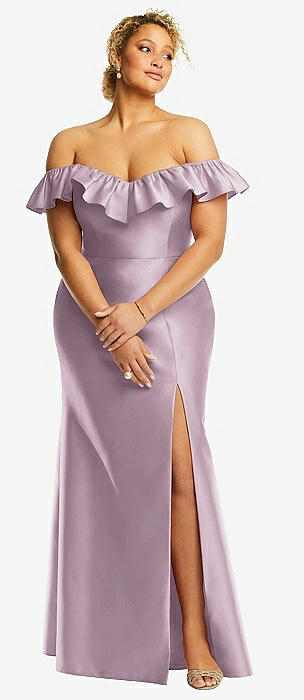 Off-the-Shoulder Ruffle Neck Satin Trumpet Gown in suede rose