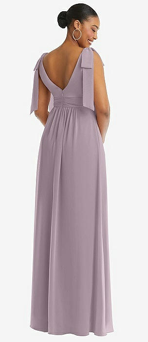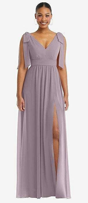 Plunge Neckline Bow Shoulder Empire Waist Chiffon Maxi Dress in lilac dusk