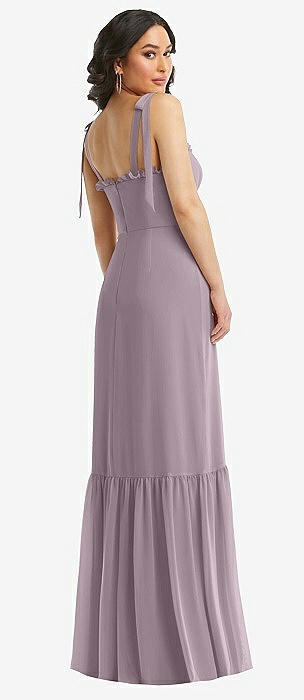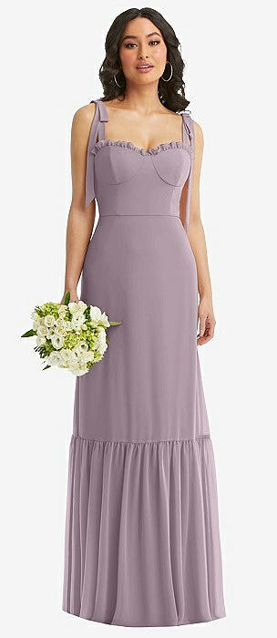 Tie-Shoulder Bustier Bodice Ruffle-Hem Maxi Dress in lilac dusk