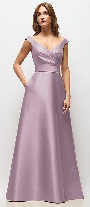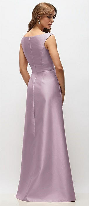 Off-the-Shoulder Draped Wrap Satin Maxi Dress in suede rose