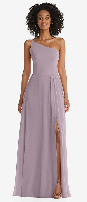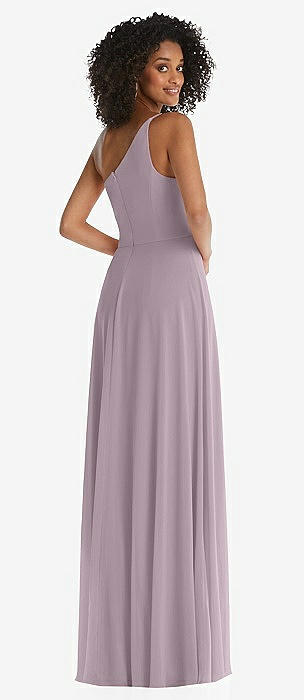 One-Shoulder Chiffon Maxi Dress with Shirred Front Slit in lilac dusk
