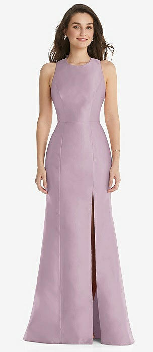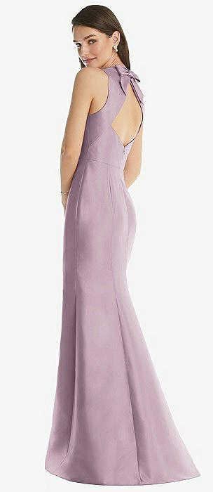 Jewel Neck Bowed Open-Back Trumpet Dress with Front Slit in suede rose