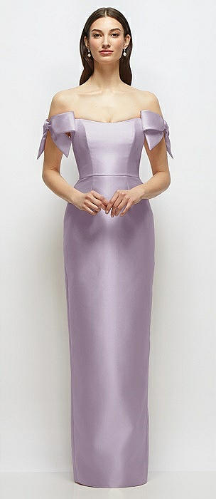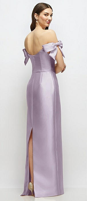 Basque-Neck Satin Column Maxi Dress with Off-the-Shoulder Bows in lilac haze
