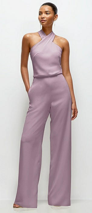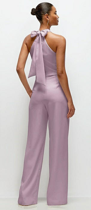 Pleated Halter Blouson Crepe Wedding Jumpsuit with Self-Tie Bow Back in suede rose