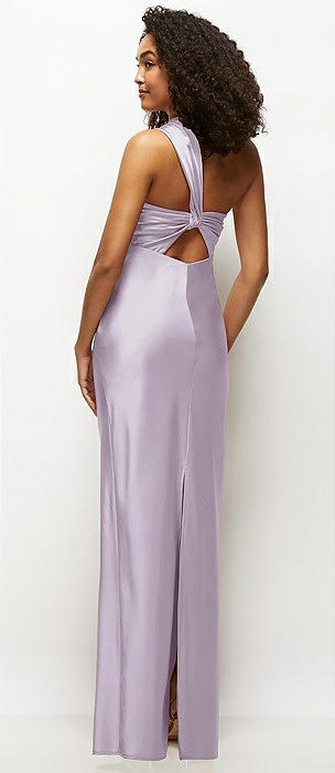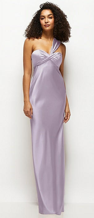 Satin Twist Bandeau One-Shoulder Bias Maxi Dress in lilac haze