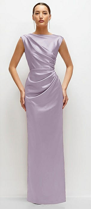 Draped Cowl-Back Princess Line Dress with Front Slit in pale purple