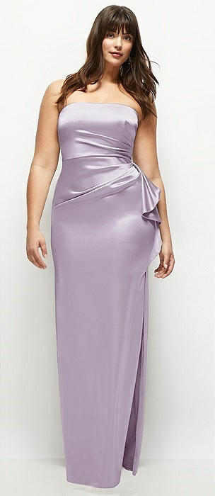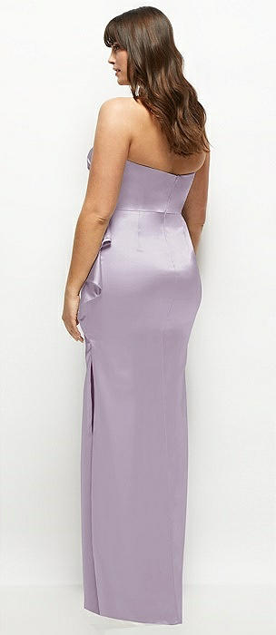 Strapless Draped Skirt Satin Maxi Dress with Cascade Ruffle in lilac haze