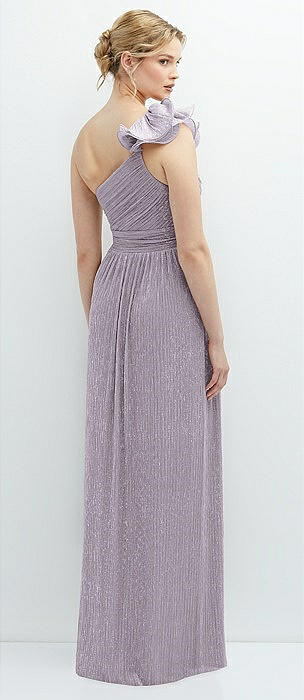 Dramatic Ruffle Edge One-Shoulder Metallic Pleated Maxi Dress in metallic lilac haze