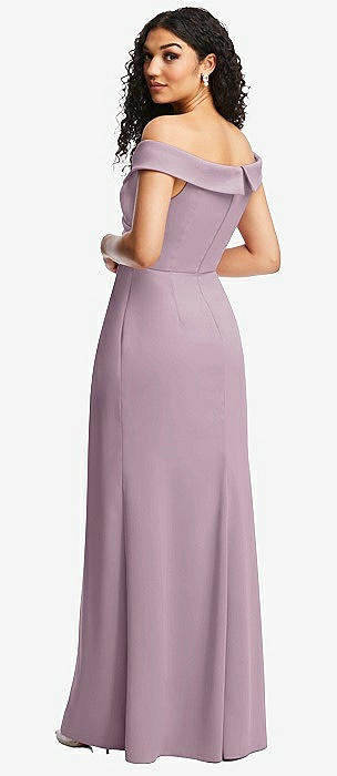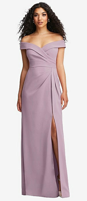 Cuffed Off-the-Shoulder Pleated Faux Wrap Maxi Dress in suede rose