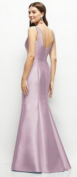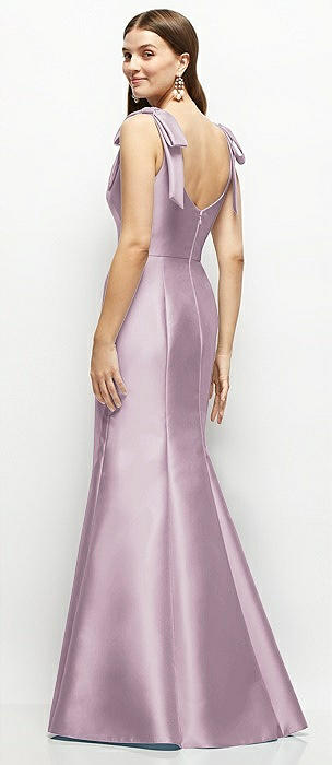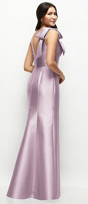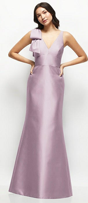 Deep V-back Satin Trumpet Dress with Cascading Bow at One Shoulder in suede rose