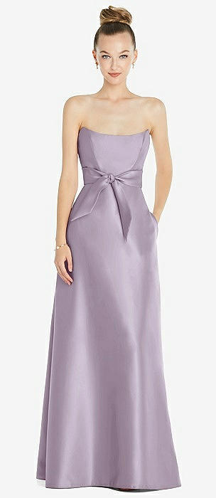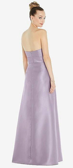 Basque-Neck Strapless Satin Gown with Mini Sash in lilac haze