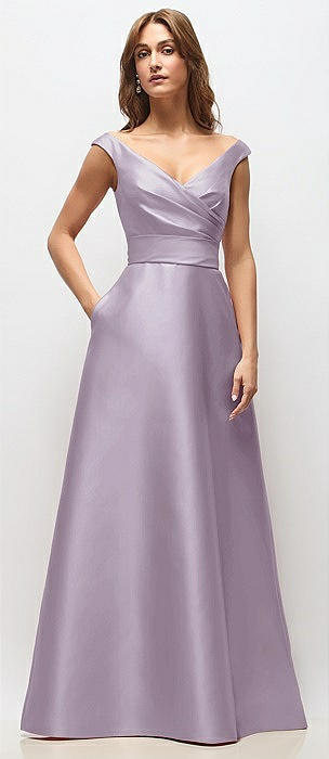 Off-the-Shoulder Draped Wrap Satin Maxi Dress in lilac haze