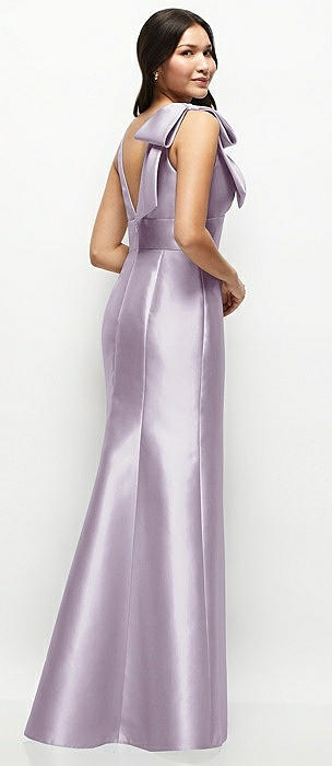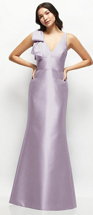 Deep V-back Satin Trumpet Dress with Cascading Bow at One Shoulder in lilac haze